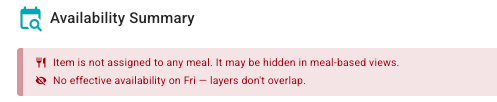 * Red content at the top provides coaching if the item needs a category or meal assigned to appear, or if the item availability needs to be updated for the restaurant or menu.