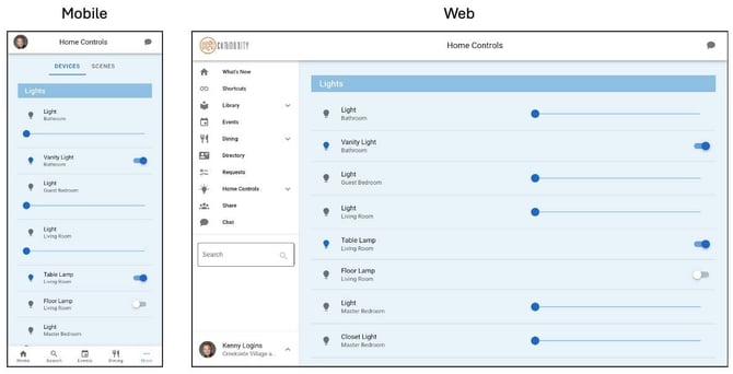Devices are organized by device type. The room the device is located in is noted under the device name.