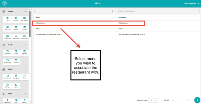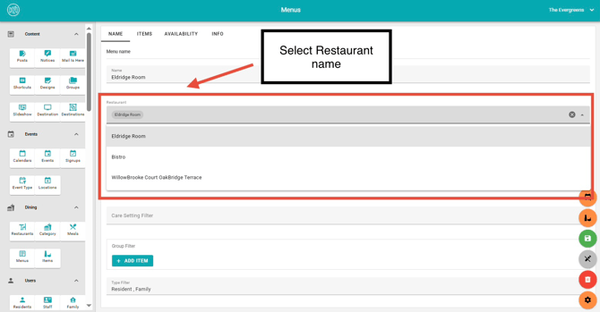 3. Select the restaurant you would like to associate with the menu.