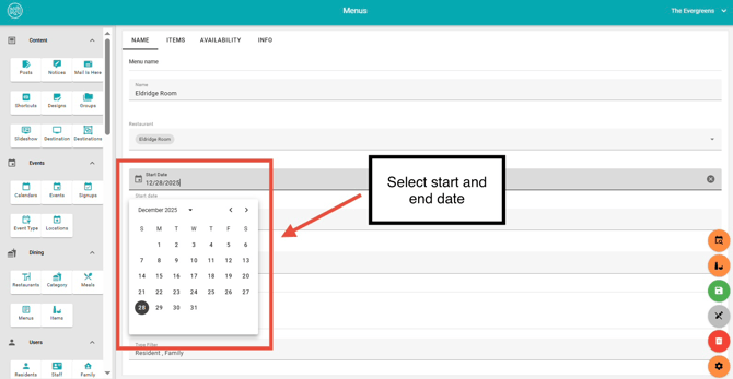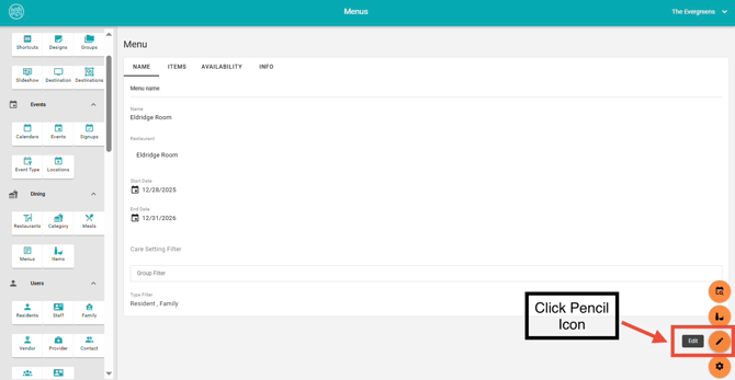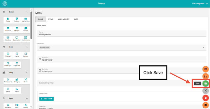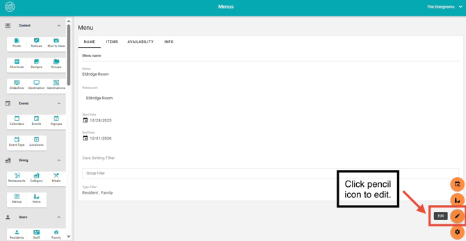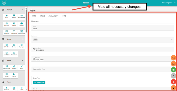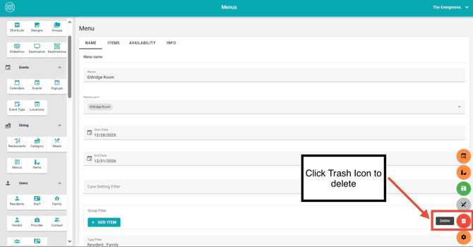 - Deleting a menu will permanently remove it from all endpoints, making it unavailable to residents, as well as friends and family users.