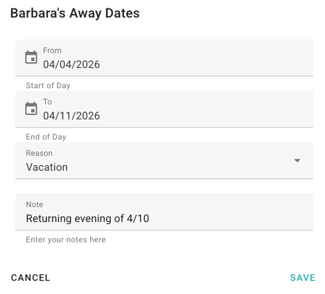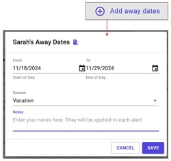 In some cases, you'll want to pause RCI alerts for residents who are going to be away from home for an extended period of time. To avoid unnecessary alerts, you can click the Add away dates button to schedule pauses in the resident's RCI alerts.