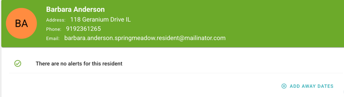 - Current and future away dates: A list of away dates for the resident that are currently active or upcoming.