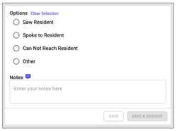 Actions to resolve the alerts are the same. Select the resident with an alert and take whatever action is necessary to confirm the resident's wellbeing. Once you've confirmed, select the appropriate option and make notes in the Notes field, if needed. If you're just updating the alert to say something other than it's resolved, like Can Not Reach Resident, click Save. This will save your notes and leave the alert open for resolution later. If the action you're documenting does resolve the alert, click Save and Resolve.