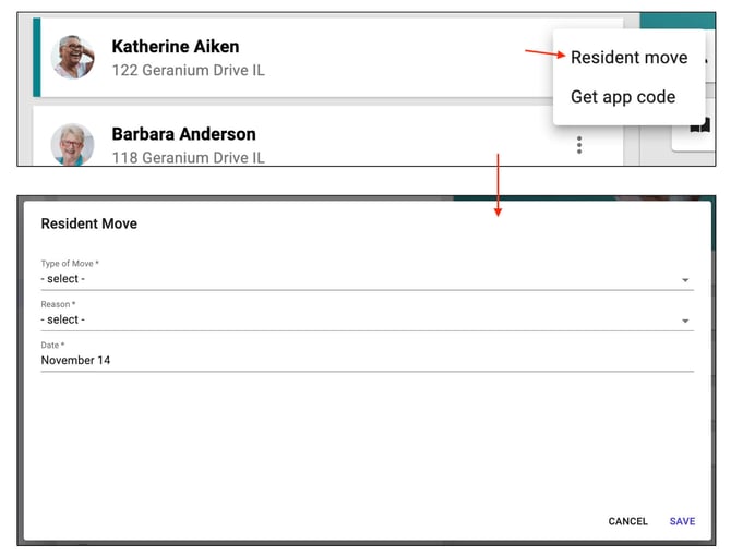 - Type of move: Move room (if the resident is moving to another location in the community), Move out (if the resident is leaving the community)