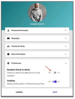In some cases, residents will not want to participate in the Resident Check-in system. This is, of course, up to the community's discretion, but if you choose to, you can turn off RCI for specific residents. This is typically accompanied by a waiver that the community provides for the residents to sign.