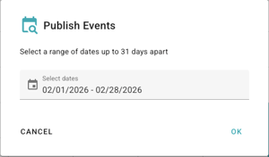 Publish Range tool lets you select up to 31 days and publish all draft events within that period