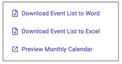 Download your events in list form for reporting purposes in either Microsoft Word or Excel formats. Also, preview your monthly calendar to see how many events will fit into the calendar grid.