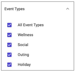Events are organized into custom event types. Use these checkboxes to control which events appear in your week at a glance view. Events can only have one event type.